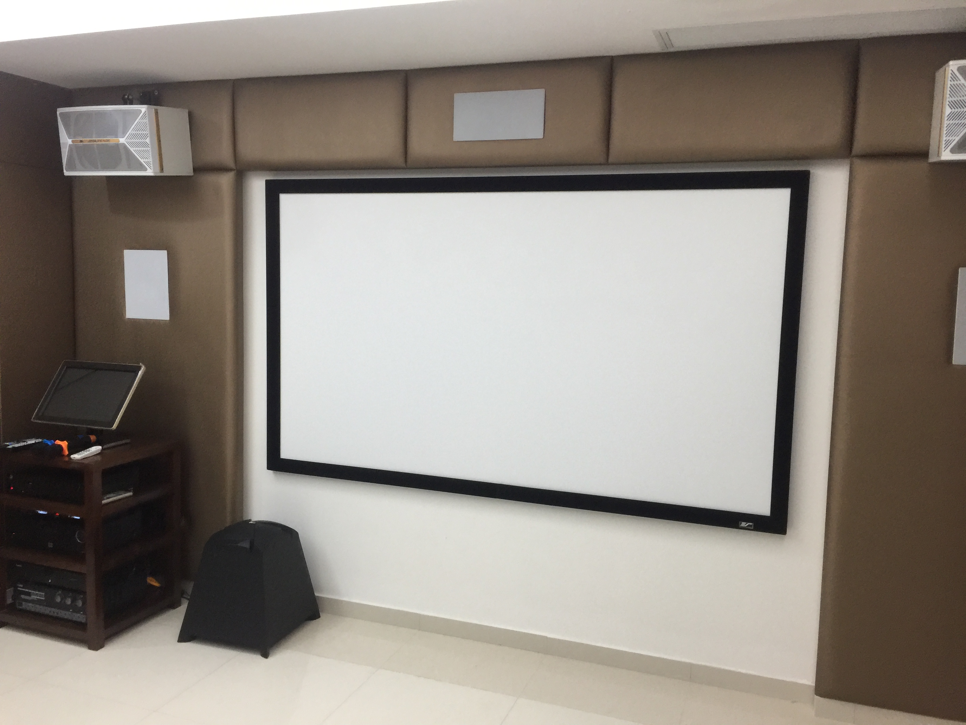 投影机一台,定制画框幕布一张,5.1嵌入隐藏式一套,卡拉OK一套。